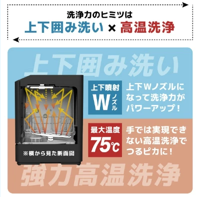 - 約75度の高温洗浄とダブルノズルで、油汚れも予洗いなしでピカピカに。「カレーの後のベタベタしたお皿もきれい」と高評価。